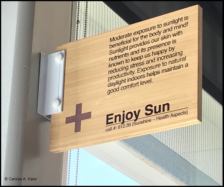 Standing up to take a break, stretch a little, and take a few steps around before returning to work in a temporary workspace for the day, the sign pictured below came into view. I read it and looked around some more. Taking in the environment and noticing more fully the ambience created by the natural light, gratitude and appreciation arose for the light and the souls who not only thought to share these interesting facts about sunlight and its benefits, but who also acted to shed the light, both in word and experience.