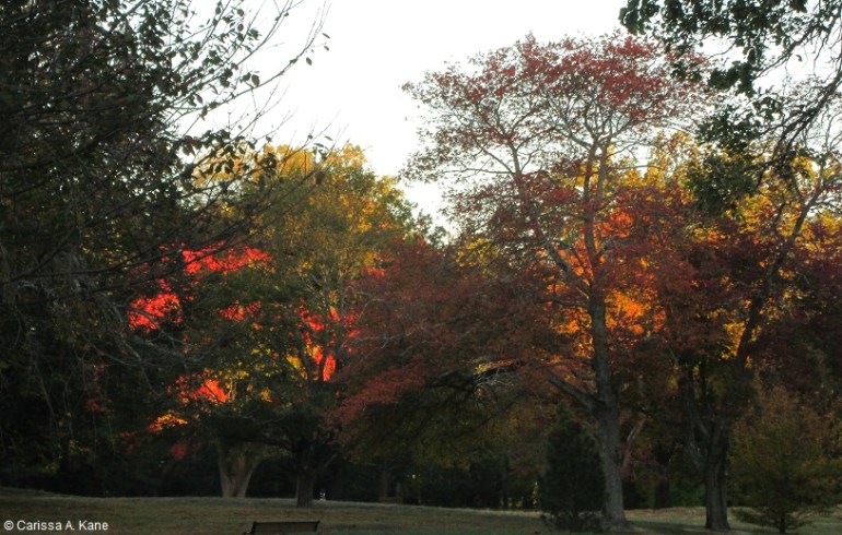 At first glance, the landscape seemed to offer little in the way of premium Fall New England colors. With a little time and upon further examination, brighter spots in between the deep, dark green became illumined. With the help of the rising sun, as it began to reach over the tops of the trees across the opposite side of the park, red, orange, and yellow, once dull and hidden, could now be seen.