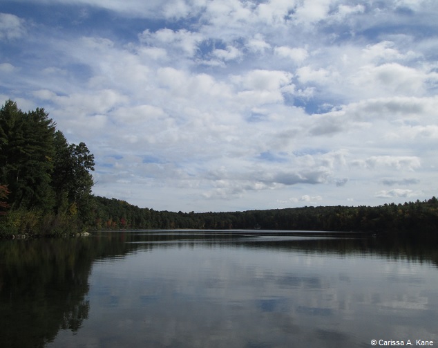 Standing at the water’s edge, initially, the stillness and clarity of the pond was so peaceful, drawing us closer, putting us in awe. Looking further out, ripples seemed to suddenly appear, although given the gentle, steady breeze, they were likely there all along, only becoming more prominent as one’s glance stretched past the calmness of the water that was closest by. Beyond the trembles, across, to the other side of the pond was more stillness. It was in the trees of mostly green, and further, the sky also steady and calm. Taken altogether, perhaps making a ripple sandwich. Oftentimes, the uneven spots are gently held between, or surrounded by, the ones that carry peace.